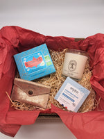 Composition du coffret : 1 bougie senteur vanille (Atelier Jolly), thé en sachets Prince Vladimir (Kusmi tea), 1 shampoing solide cheveux normaux (Endro), 1 porte carte en cuir (Atelier Malicieux)