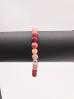 Celui ci, dans les tons roses est composé des pierres Quartz rose, Calcite rose, Rhodonite rose et Œil du tigre teinté fushia pour avoir une sensation d'amour et de douceur (descriptif plus complet des bienfaits sur simple demande).
