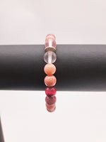Celui ci, dans les tons roses est composé des pierres Quartz rose, Calcite rose, Rhodonite rose et Œil du tigre teinté fushia pour avoir une sensation d'amour et de douceur (descriptif plus complet des bienfaits sur simple demande).